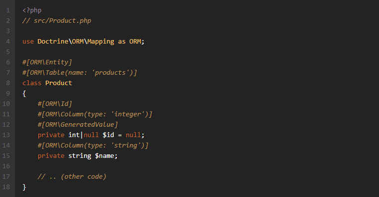 Dans cet exemple, nous utilisons des attributs (PHP 8+) pour définir le mapping (le lien entre l'objet et la table).